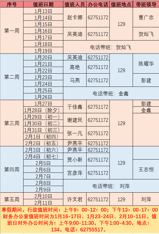 2.学院财务办公室寒假值班日期为1月16-17日、1月23-24日、2月10-11日。值班日对外办公时间为:上午9:00-11:30,下午1:00-4:30,值班地点:134,值班电话:62755517。