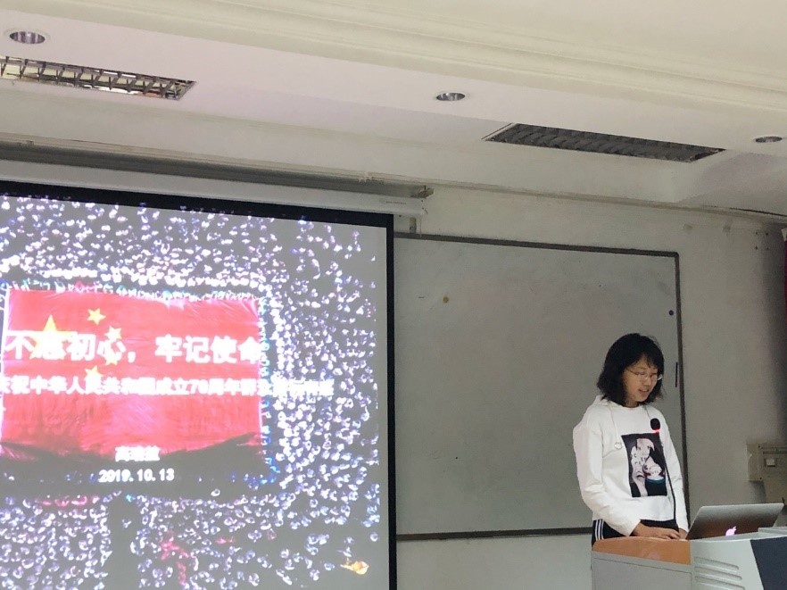 首先,2016级城规班范文颖同学和2015级城规班高瑜堃同学分别向与会党员做线下学习心得交流分享。范文颖同学分享了她学习关于“不忘初心、牢记使命”重要论述的体悟——青年力量是希望之所在。她认为,新时代下,党与青年的联系更为紧密,党更好地与青年进行沟通,将爱国、爱党的信念种在青年人的心中。而我们作为北大青年,应该承担起自己的责任使命,找到自己的位置,努力奋斗。高瑜堃同学则用风趣的语言分享了她参与庆祝中华人民共和国成立70周年群众游行的感受,阐述了她自己对于“不忘初心,牢记使命”的理解:“不忘初心”,不忘的是一颗中国心,一个能让我们抛弃一切狭隘的个人利益带来的琐碎的烦恼和人之间的不同,倾心而听的理由。“牢记使命”,牢记的是让中国强起来的使命,是要在很近的将来实现中国的政治、经济、文化和科技高度自信的使命。