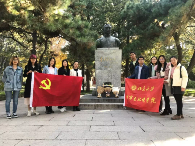 2019年10月31日上午,支部成员前往静园草坪祭扫革命烈士纪念碑和李大钊先生铜像。北京大学革命烈士纪念碑呈“心”字型,坐落于燕园的静园草坪北侧,由几块红色大理石组成。纪念碑于1993年5月4日揭幕,纪念从1919年“五四”运动到新民主主义革命取得全国胜利期间,为中国的民族解放和人民革命事业英勇献身的北京大学83位师生。其旁矗立的李大钊先生铜像由北大七七、七八两届毕业生怀念敬立,以纪念这位我国共产主义的先驱、伟大的马克思主义者。