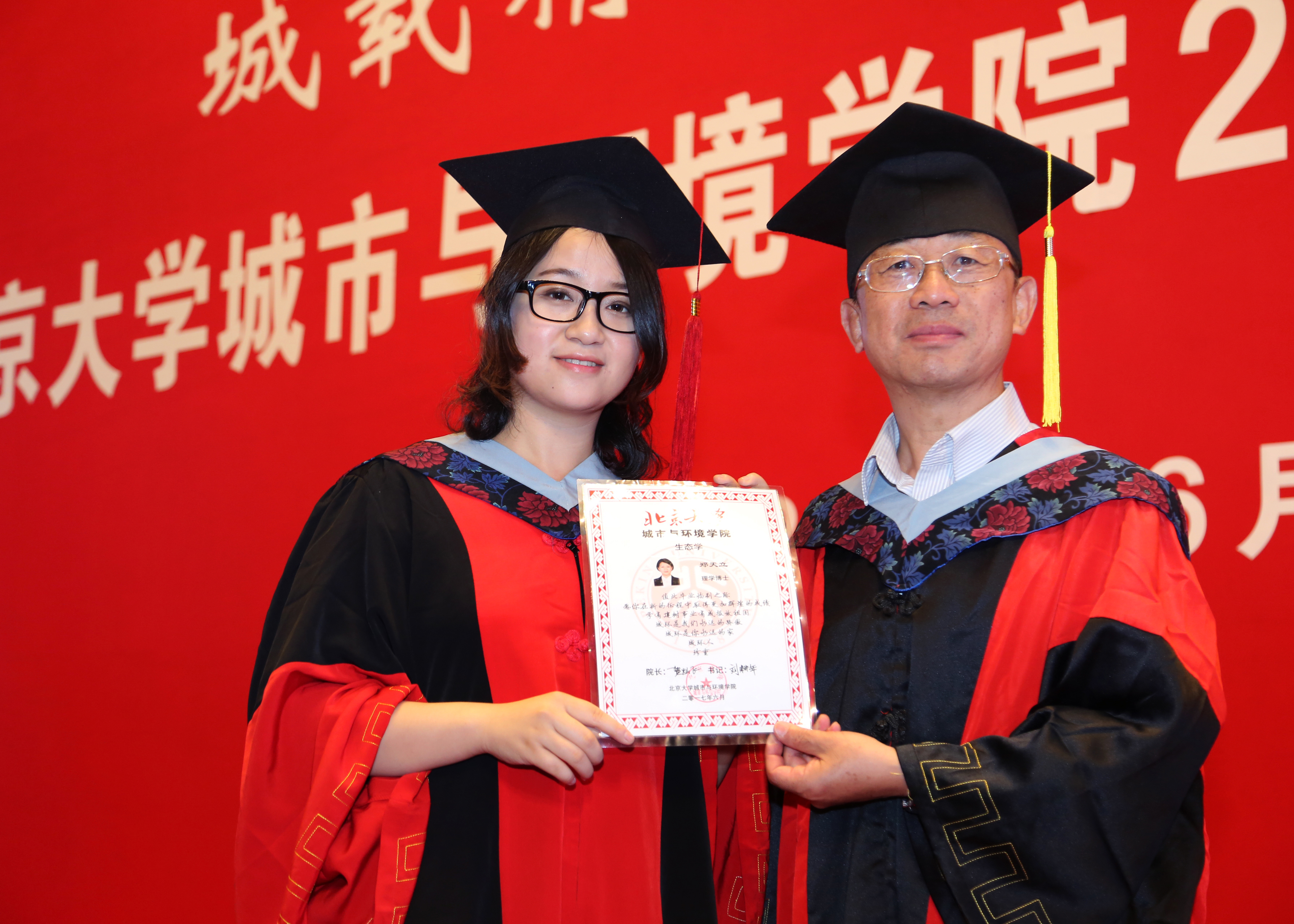 学院副院长李本纲老师、李双成老师分别宣读本科生、研究生学位授予决定,院长贺灿飞老师和党委书记刘耕年老师为学生拨穗、颁发纪念证书并合影。