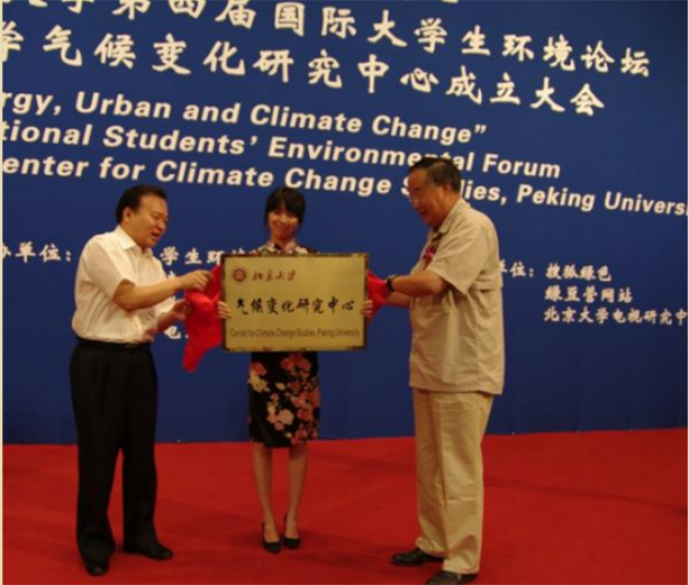 2009 年 5 月 31 日北京大学党委副书记张彦(左一)和秦大河院士(左三)在北京大学第四届国际大学生环境论坛上为北京大学气候变化研究中心揭牌