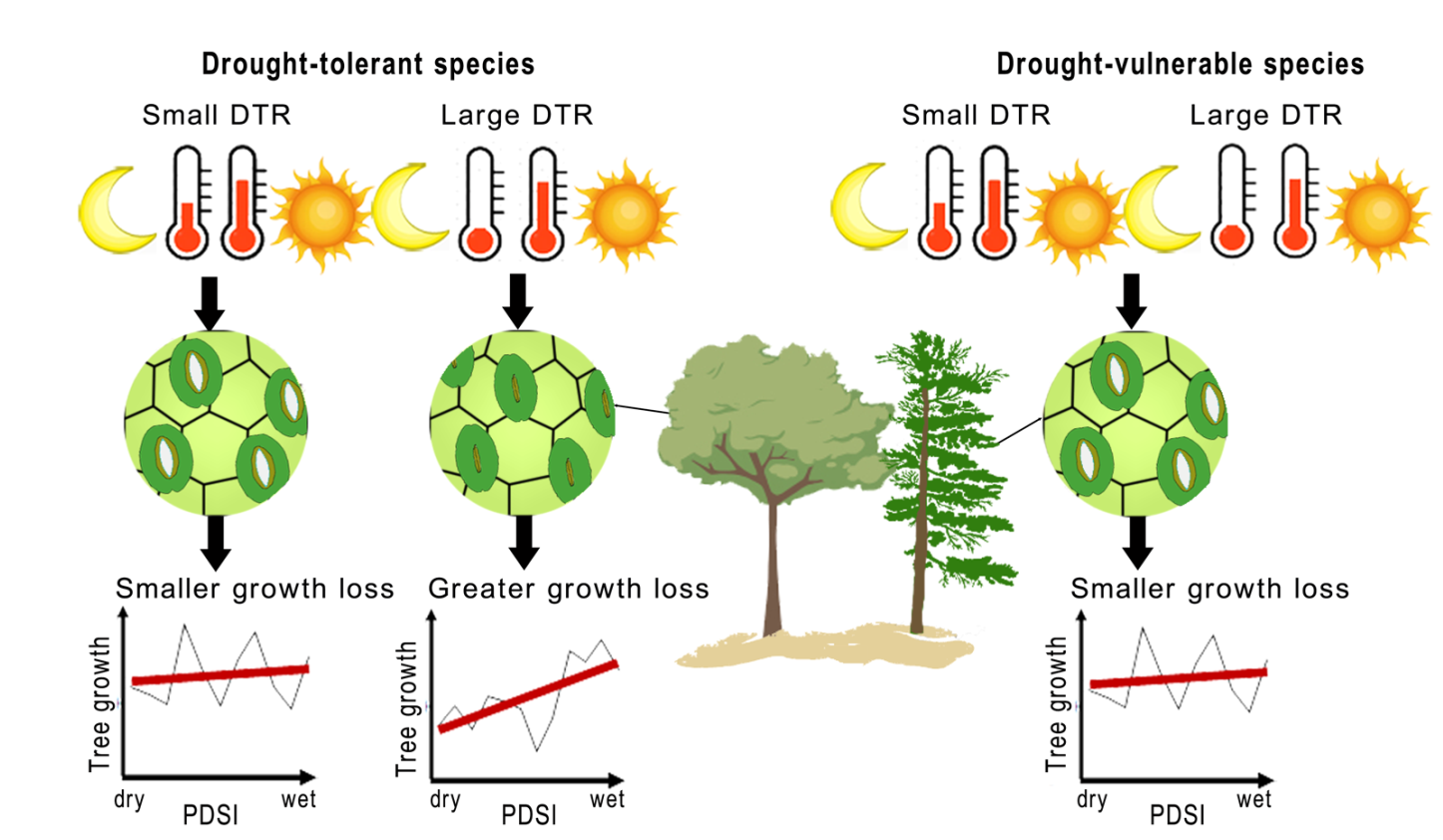 发布时间:2023-11-01全球变暖背景下,干旱的加剧造成大范围的树木生长下降或死亡现象,严重影响着森林的碳汇功能。已有研究一致表明白天升温比夜晚升温速率快加剧了干旱对树木生长的不利影响,而夜晚升温与干旱的协同作用既可能加剧也可能缓解干旱对生长的不利影响:人工模拟控制试验的结果大多表明夜间增温加剧了干旱的不利影响,而自然条件下的研究表明夜间增温减缓了干旱的不利影响。这可能是不同树种的不同抗旱策略导致树木对夜间增温的差异化响应。由于不同树种在面对干旱时的应对策略不同,随着变暖的加剧,昼夜温差变化与干旱的交互作用如何影响不同树种的生长依然是一个谜题。