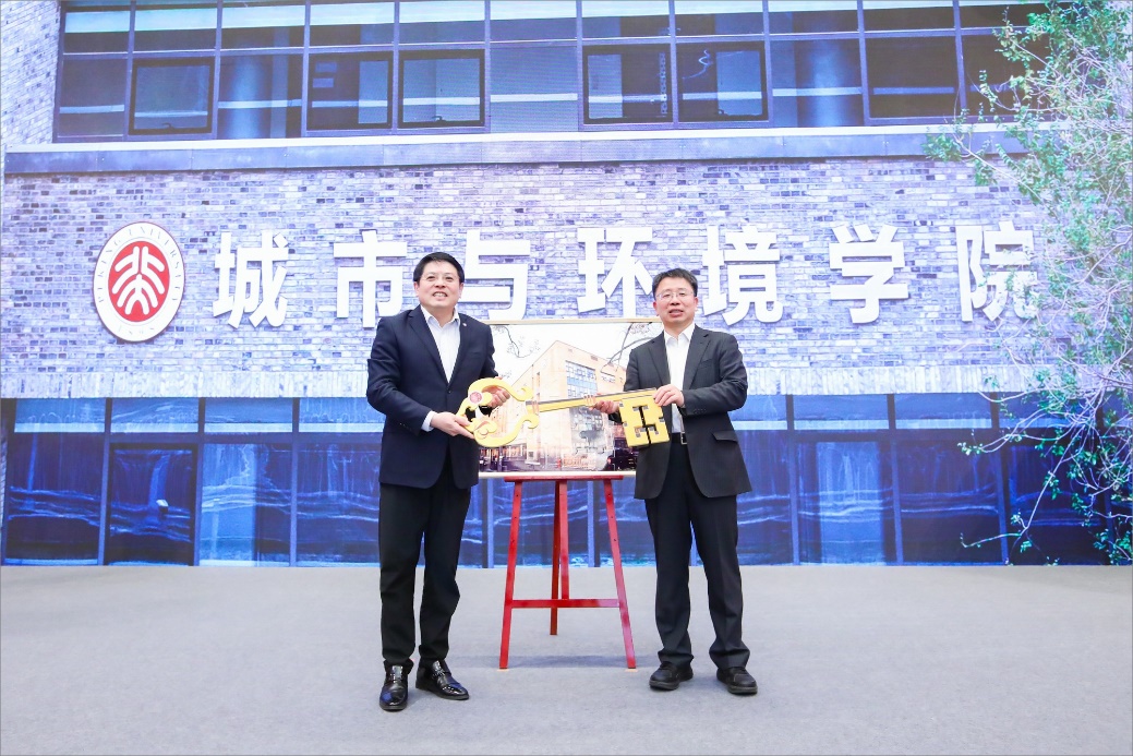 城市与环境学院新大楼于2021年7月竣工,并在次年完成整体搬迁,将学院过去分散在校园各地的教学、科研空间整合集聚。董志勇与贺灿飞一同完成具有象征意义的大楼竣工拼图,并将大楼“钥匙”交予贺灿飞,共同开启新楼大门。