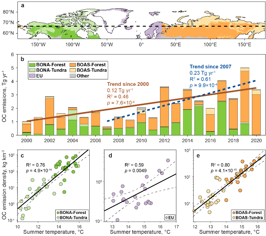 发布时间:2024-11-18在全球气候变化的背景下,北极和亚寒带地区(也称北方地区)的变暖速度远超全球平均水平。这种快速气候变暖与北方地区近年来频发的野火密切相关,如西伯利亚、加拿大等地在2019至2023年间多次受到极端野火的侵袭,引发了科学界和公众的广泛关注。野火活动会释放大量气溶胶进入大气,其通过与辐射、云的相互作用可改变局地气候,对北极地区的影响尤为突出。