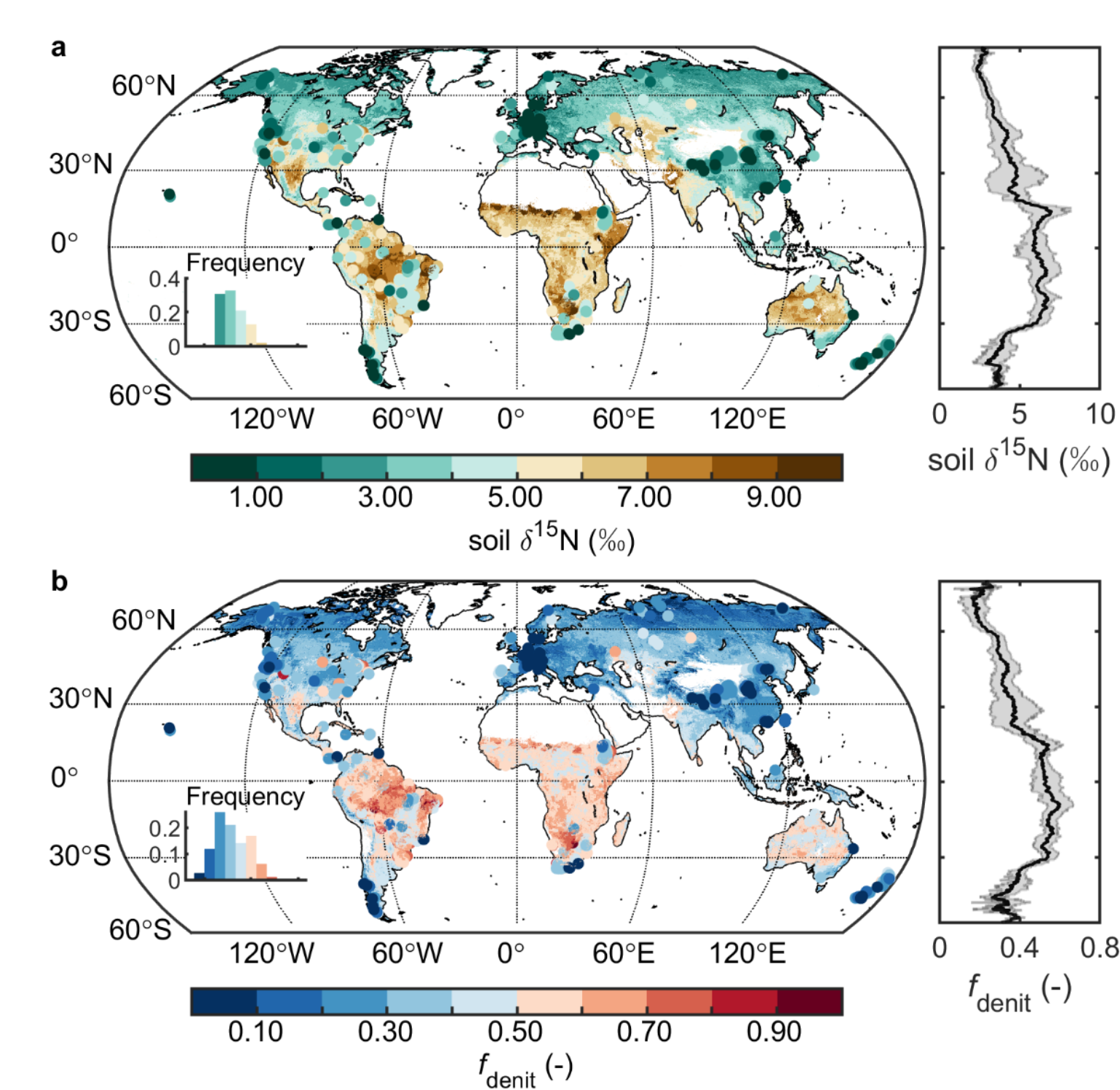 图1. 全球土壤氮同位素比(d15N)空间分布格局,以及基于土壤d15N反演的反硝化氮损失在总氮损失中的比例(fdenit)