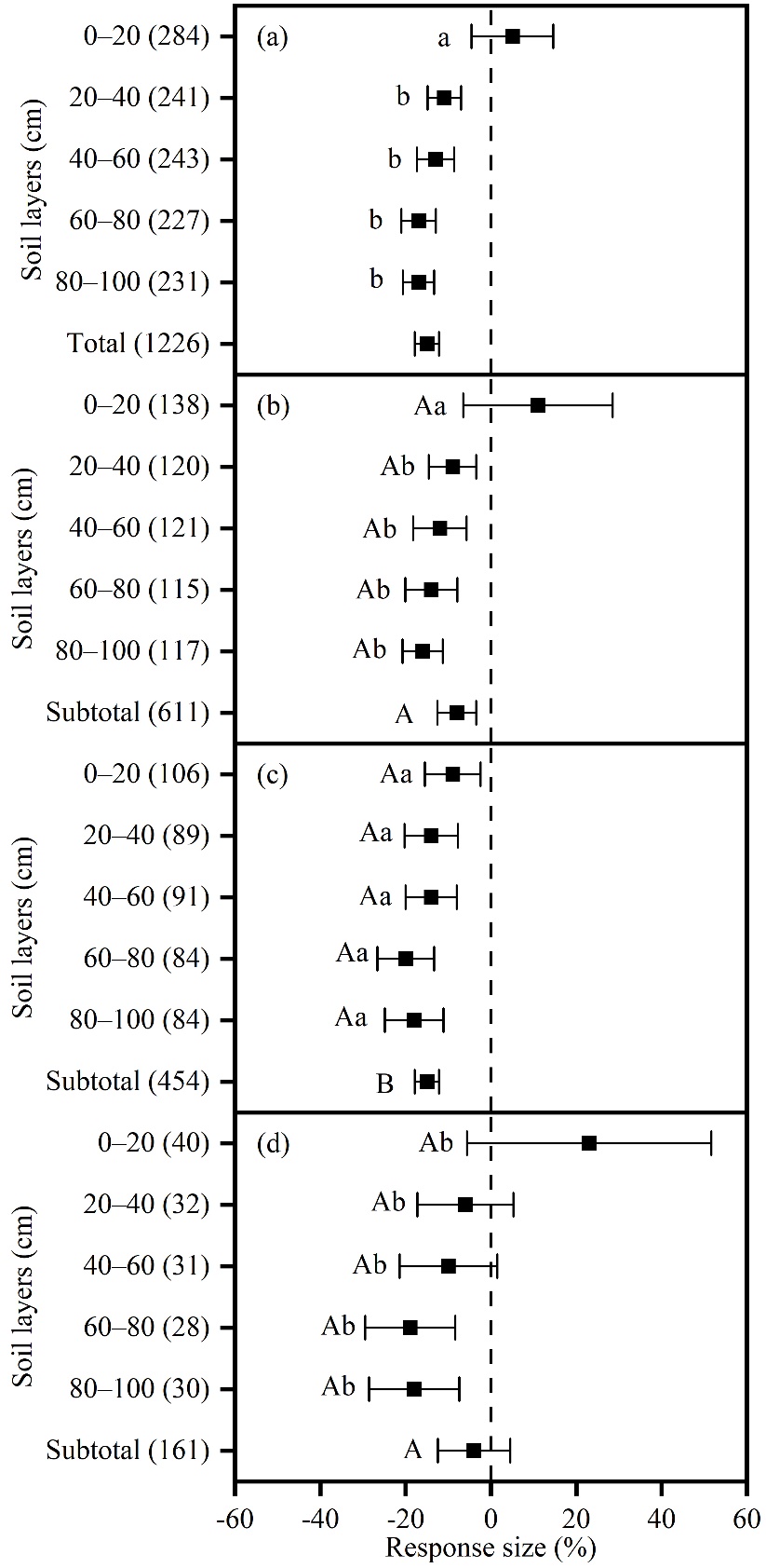 图1. 中国北方不同林龄人工林对土壤水的影响。(a),全部人工林;(b),≤20年;(c),21-40年;(d)>40年。